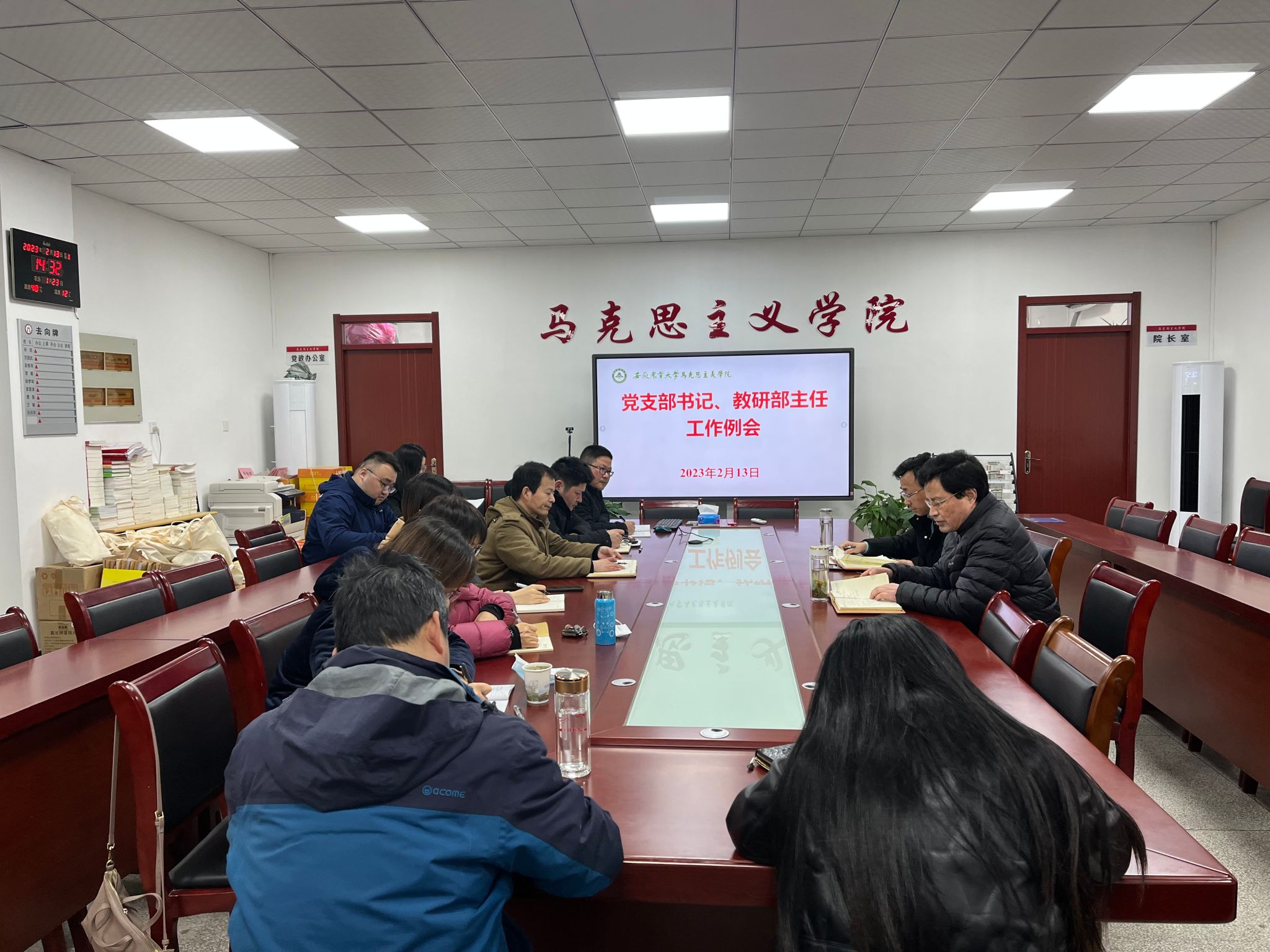 本网讯 2月13日下午,马克思主义学院在人文楼302会议室召开新学期工作会议,研究部署本年度重点工作和开学准备工作,会议由学院党委书记孙超主持,党委副书记、院长方国武、各党支部书记、教研部主任、办公室人员等参加了会议。