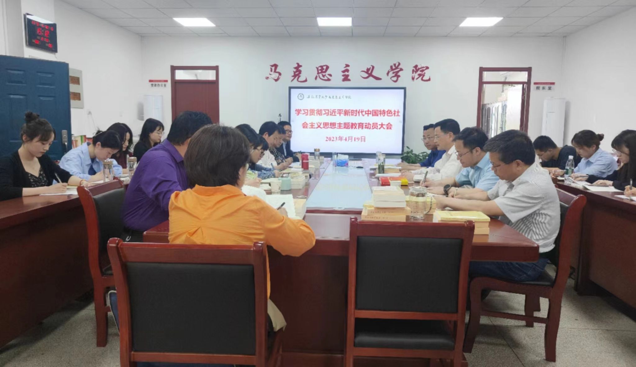 本网讯 4月19日下午,马克思主义学院在人文楼302室召开学习贯彻习近平新时代中国特色社会主义思想主题教育动员会,对学院深入开展主题教育进行动员部署。会议由院党委书记孙超主持。学校主题教育领导小组办公室程玉峰、院党委副书记、院长方国武、院党委副书记、纪委书记、副院长袁修雨以及院党委委员、各党支部书记、副书记、委员、各教研部、中心主任、教师代表、学生代表等参加了会议。