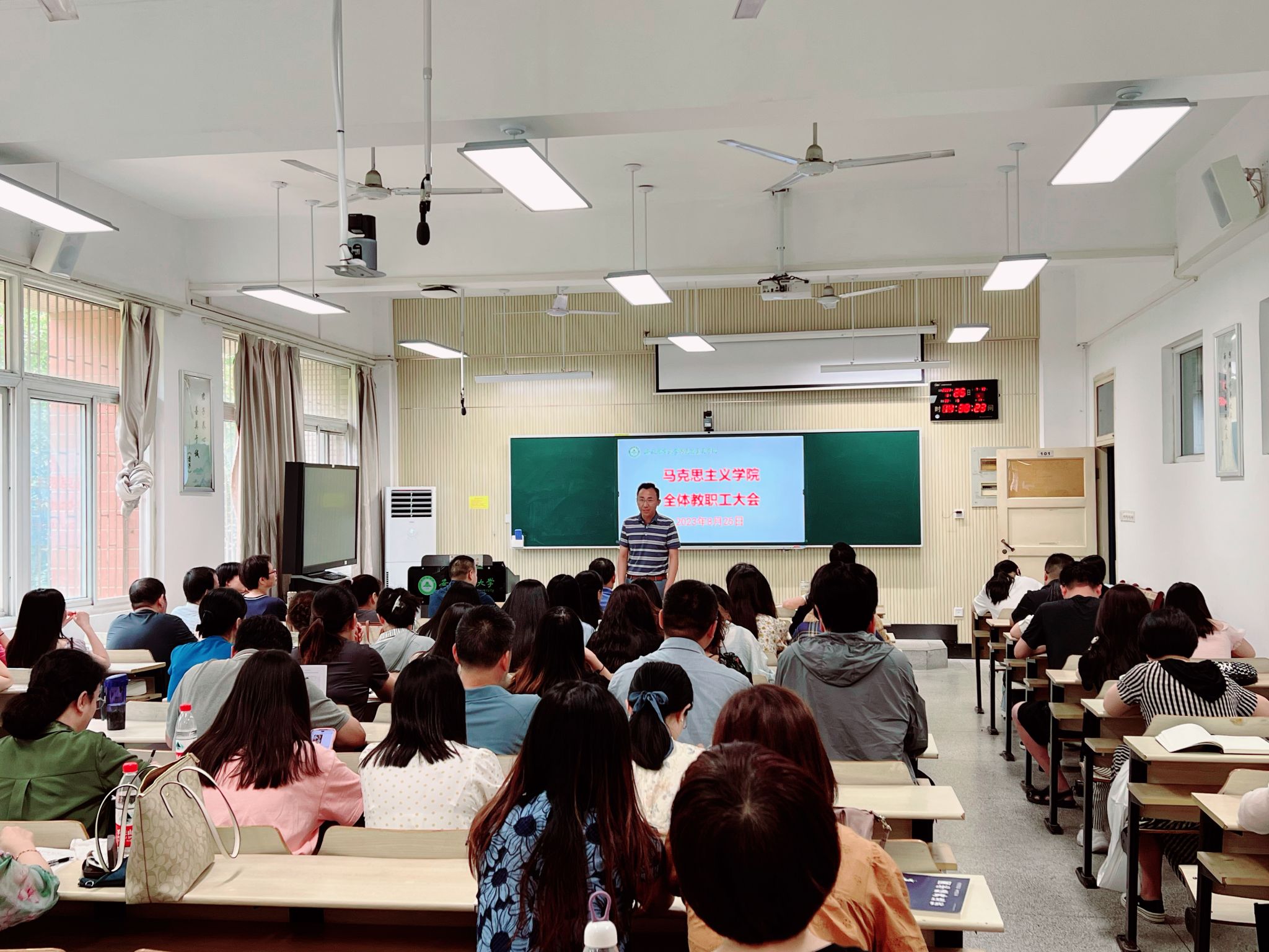 本网讯 8月25日下午,马克思主义学院在人文楼101召开全体教职工大会,部署新学期各项工作。院党委书记孙超,党委副书记、院长方国武以及全体教职工参加了会议。