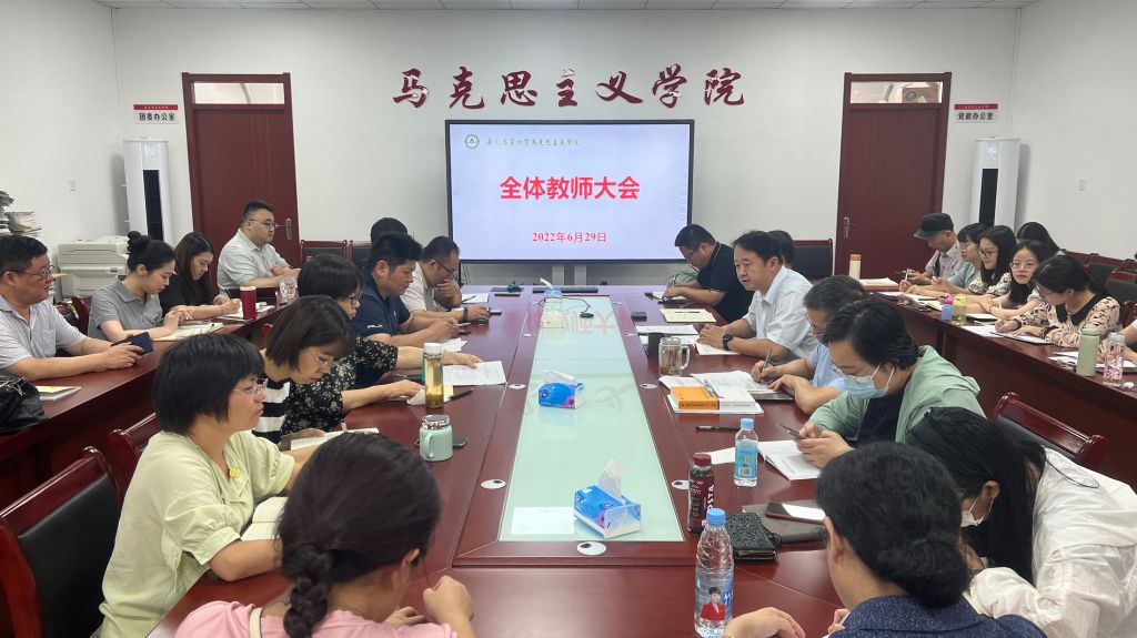 本网讯 6月29日下午,马克思主义学院召开全体教师会,学习习近平总书记给安徽省太和县种粮大户重要回信、省委书记郑栅洁来校调研讲话精神以及学校暑假工作部署会精神,全面总结本学期工作,部署暑期及下一阶段重点工作。院党委书记、院长黄洪雷主持会议,全体教师参加会议。
