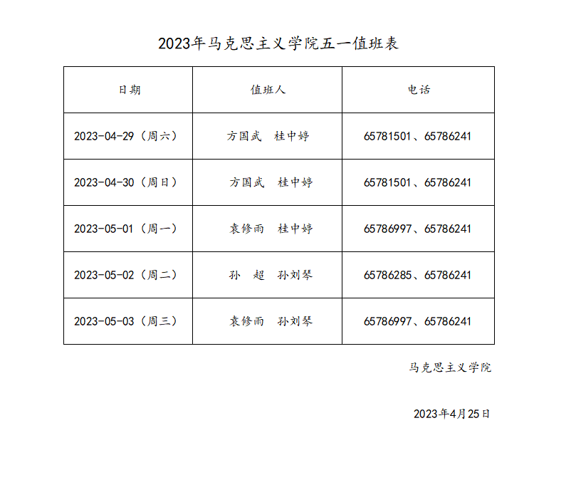 2023年马克思主义学院五一值班表