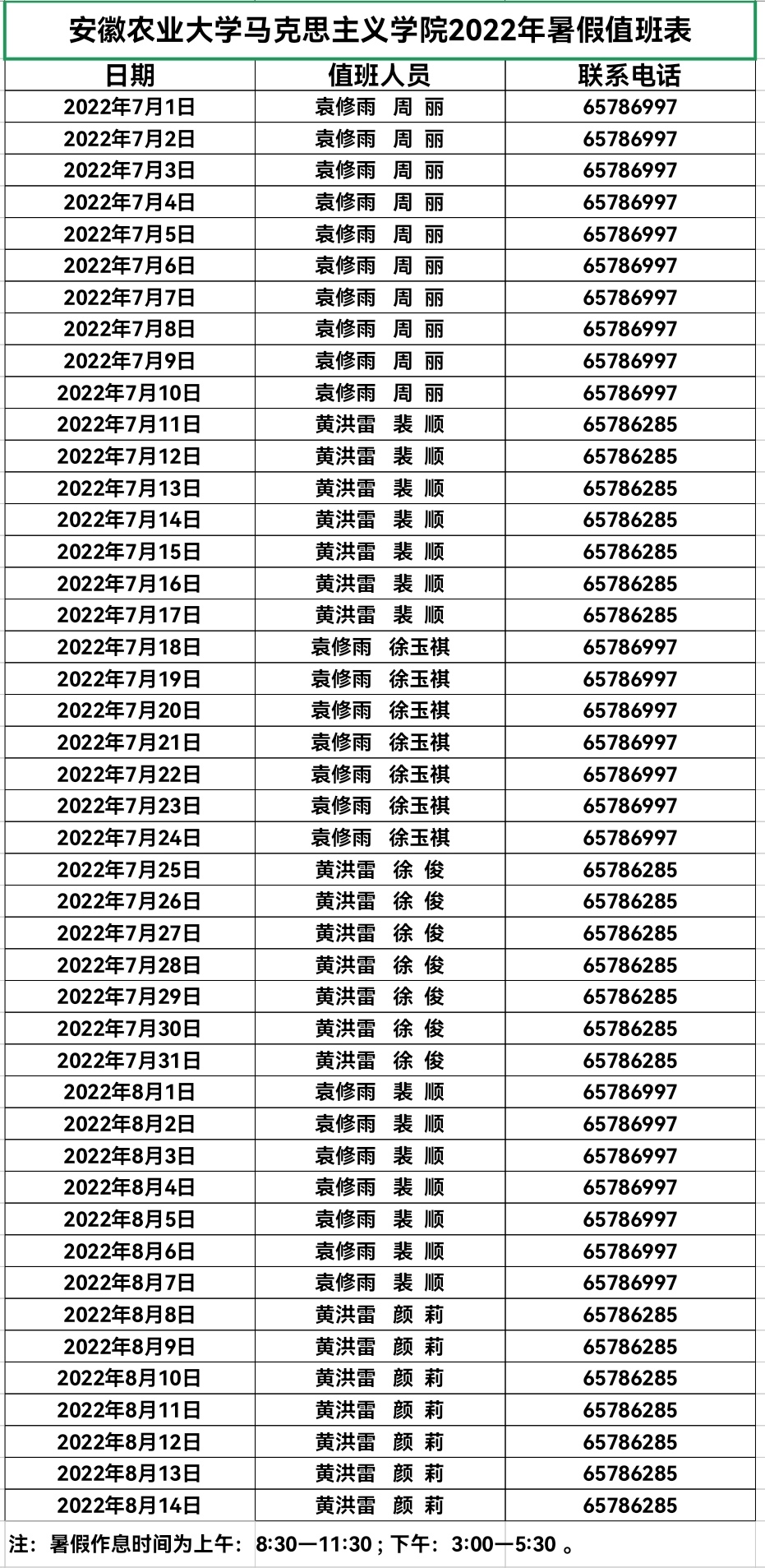 马克思主义学院2022年暑假值班表