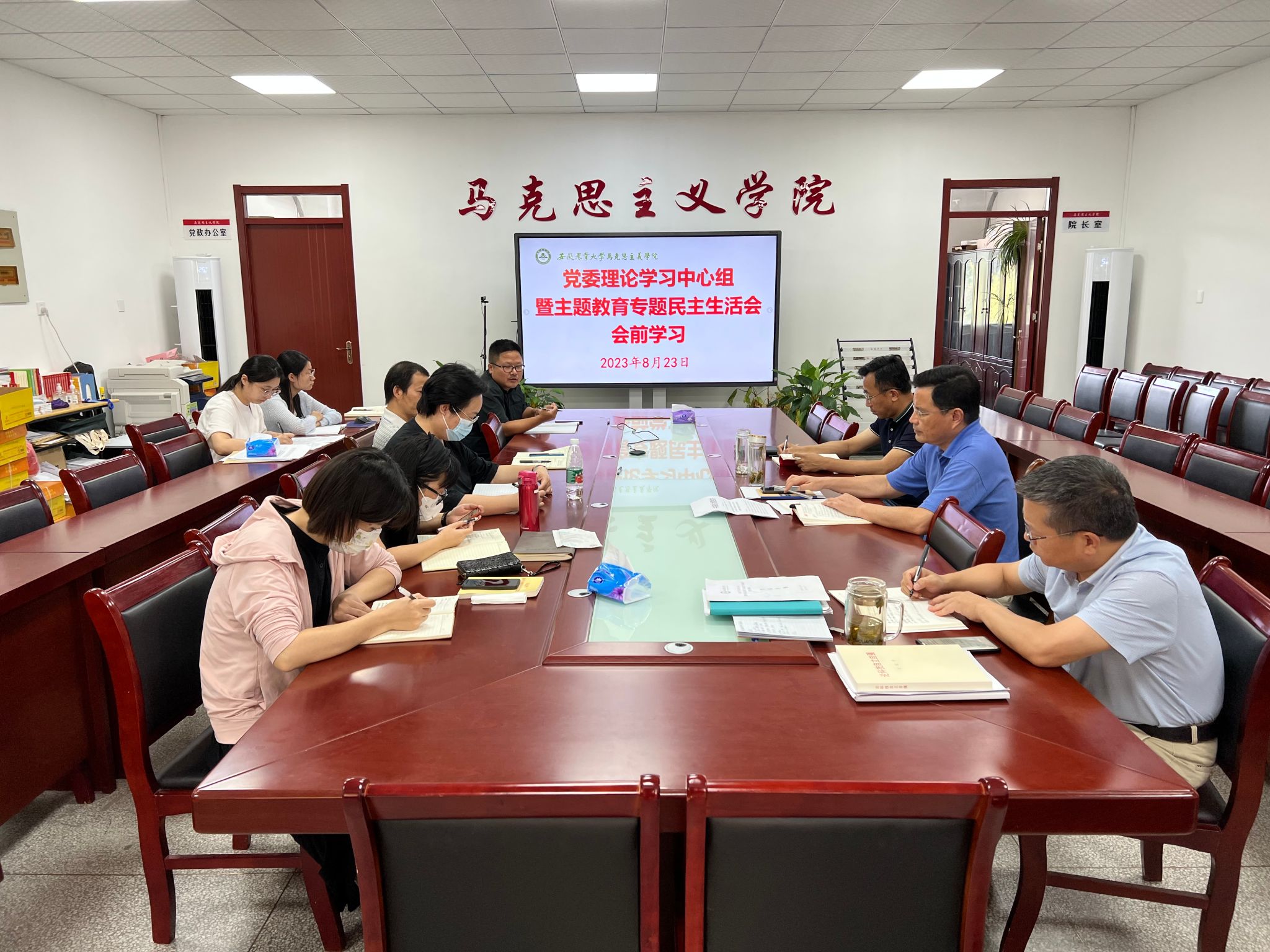 本网讯 为做好学习贯彻习近平新时代中国特色社会主义思想主题教育检视整改,确保主题教育成效,扎实开展好专题民主生活会,8月23日,马克思主义学院在人文楼302室召开党委理论学习中心组暨主题教育专题民主生活会会前集中学习会,学院党委书记孙超主持会议。党委副书记、院长方国武,党委副书记、纪委书记、副院长袁修雨,学院党委委员、党支部书记出席会议。