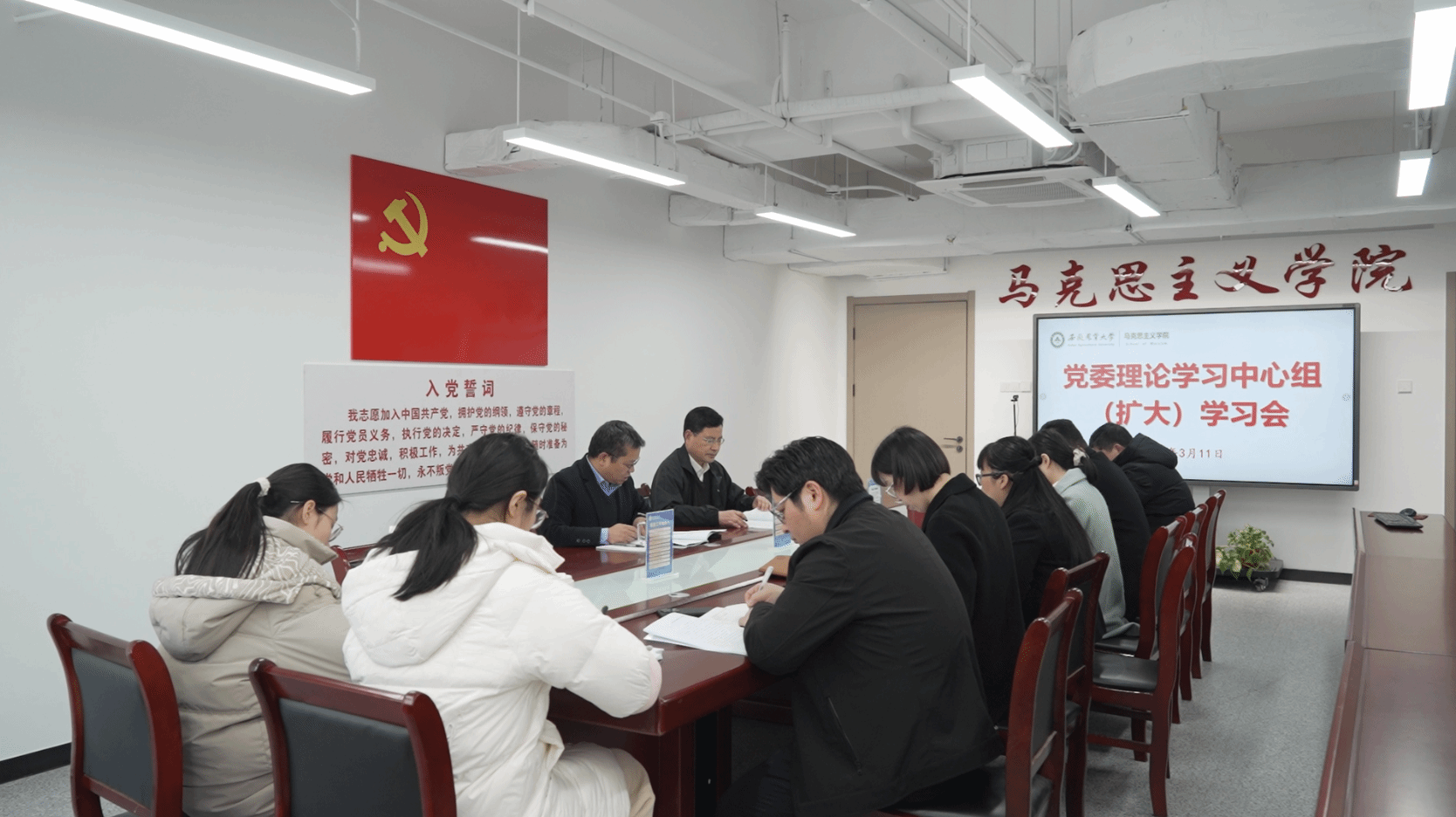 本网讯 3月11日下午,马克思主义学院在勤业楼1010室召开党委理论学习中心组(扩大)学习会,会议由院党委书记孙超主持。党委副书记、纪委书记、副院长袁修雨、学院党委委员、党支部书记等参加了会议。
