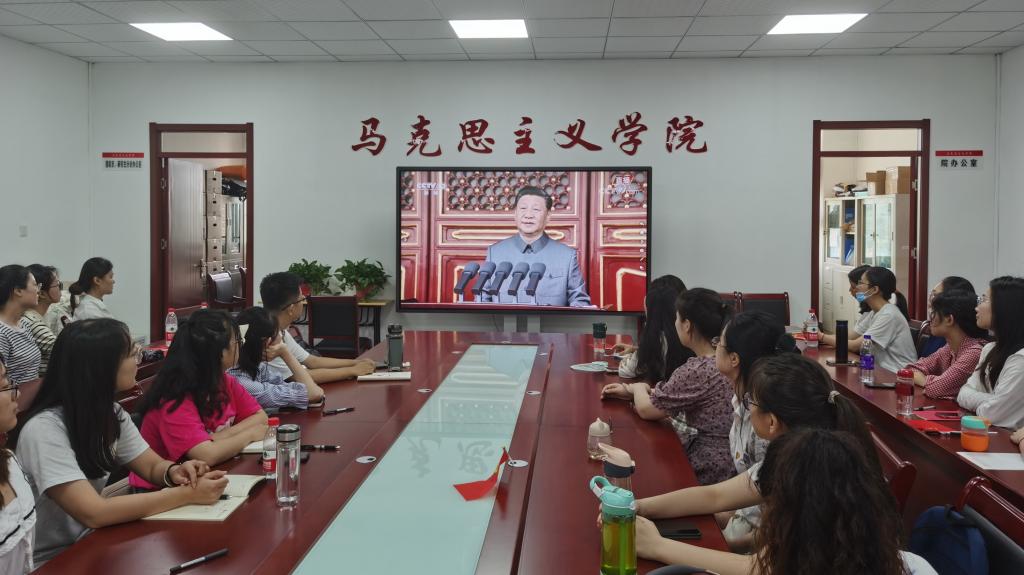 本网讯 7月1日上午,庆祝中国共产党成立100周年大会在北京天安门广场隆重举行,习近平总书记发表重要讲话。马克思主义学院全体师生集中收看了大会的现场直播,聆听了习近平总书记的重要讲话。庆祝大会一结束,学院党总支即召开中心组(扩大)学习会,专题学习了习近平总书记“七一”重要讲话。