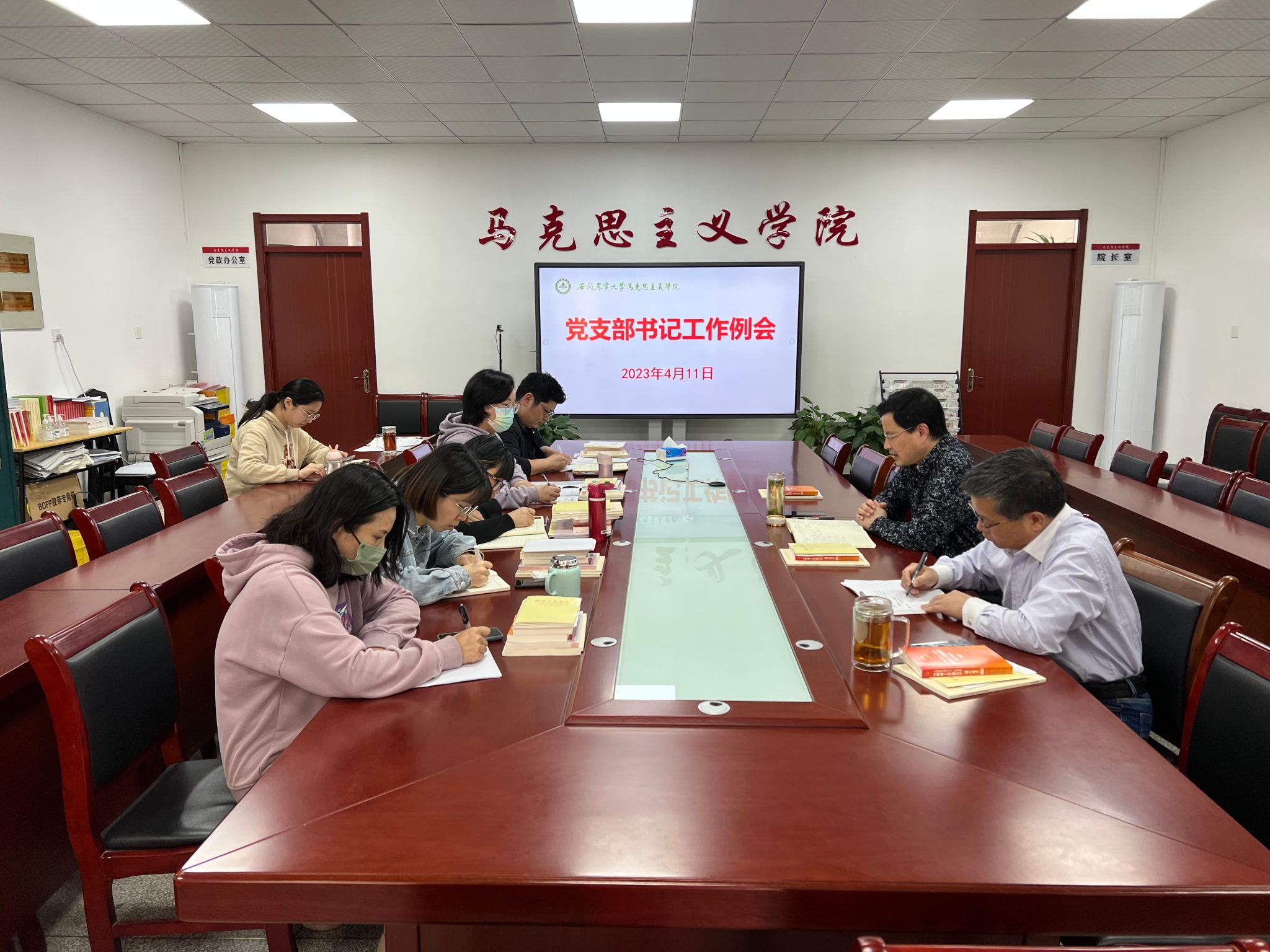 本网讯 4月11日下午,马克思主义学院在302会议室召开党委理论学习中心组学习会,党委副书记、院长方国武,院党委副书记、纪委书记、副院长袁修雨以及各党支部书记参加会议,院党委书记孙超主持会议。