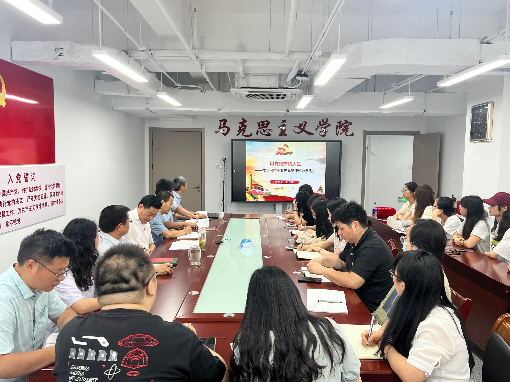 本网讯 为庆祝中国共产党成立103周年,推动党纪学习教育走深走实,7月1日上午,马克思主义学院举行庆祝中国共产党成立103周年表彰暨党纪学习教育专题辅导会。会议由院党委书记孙超主持。全体院领导、党委委员,支部书记、支委,学院2024年上半年全体新发展党员参加会议。