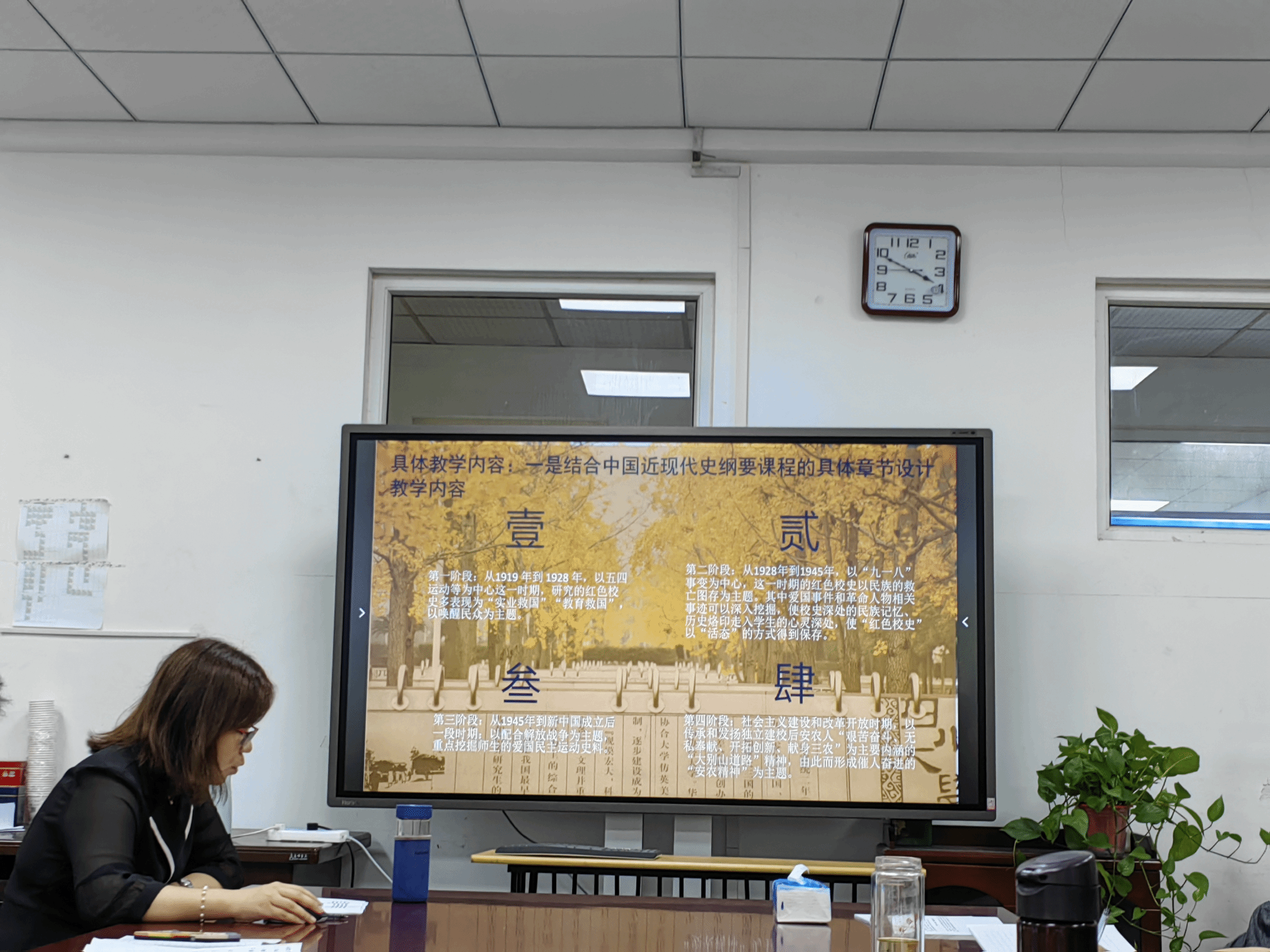会议开始由教研部主任颜莉详细介绍本学期的教学任务,主要包括线下理论教学、线上网络教学额实教学践方案的落实等内容。李春梅老师展示了如何将“红色校史”资源融入《中国近现代史纲要》课,得到了与会教师的一致好评,参会教师进行了热烈的讨论。