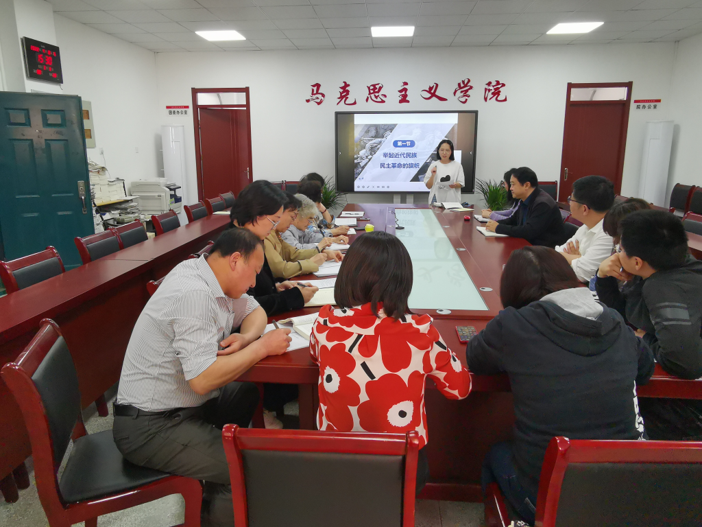 本网讯 “纲要”教研部本学期的一项重要工作就是利用集体备课进行磨课,组织教研部全体教师将教材所有内容重新梳理一遍。每次备课会前由教研部主任安排1-2位教师提前准备,在备课会上进行教学示范。4月8日下午,中国近现代史教研部举行了集体备课会,院党委书记、院长黄洪雷,党委副书记、纪委书记、副院长袁修雨,校督导组杨梅、胡蕙露、郭其智老师,院督导组刘雪英、高红老师及“纲要”教研部全体老师参加了会议,会议由袁修雨主持。