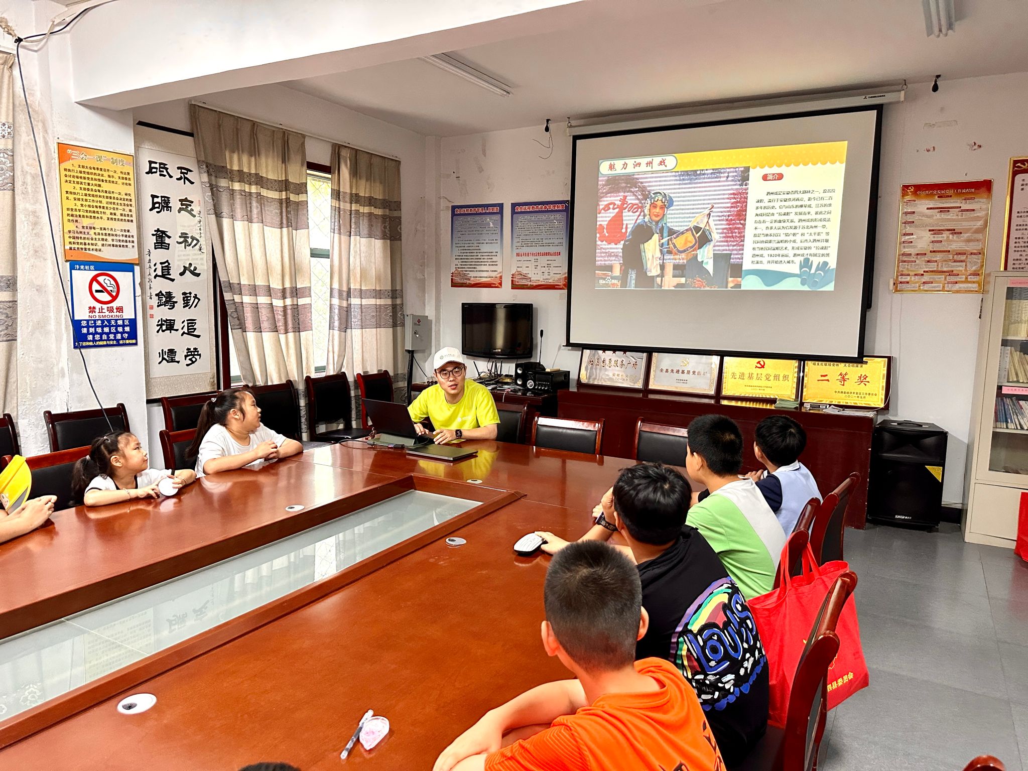 传承,就是戏曲最好的样子。青少年是戏曲艺术的未来,为助力传承中华优秀传统文化,担任起新时代的文化使命。7月18日,实践团成员来到汴光社区向小朋友们宣传讲解泗州戏。小朋友们说:泗州戏我们从小就听,还都会哼几句呢!在社区小课堂上,团队成员通过讲故事、做游戏和现场演唱等环节设计,让小朋友们在轻松愉悦、寓教于学中感受到了传统戏曲之美,对泗州戏的热爱洋溢在一张张笑脸中。本次戏曲宣传活动用丰富多彩的文化传统浸润了小朋友们的心田、照亮了传承之梦。之后团队其他成员开展了保护环境、暑期安全教育的小课堂,也让小朋友们在欢乐中掌握了生活知识。
